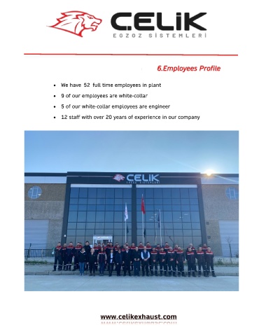 6.Employees Profile • We have 52 full time employees in plant • 9 of our employees are white-collar • 5 of our white-collar employees are engineer • 12 staff with over 20 years of experience in our company www.celikexhaust.com