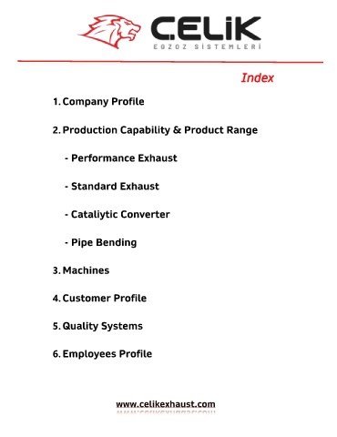 Index 1. Company Profile 2. Production Capability & Product Range - Performance Exhaust - Standard Exhaust - Cataliytic Converter - Pipe Bending 3. Machines 4. Customer Profile 5. Quality Systems 6. Employees Profile www.celikexhaust.com